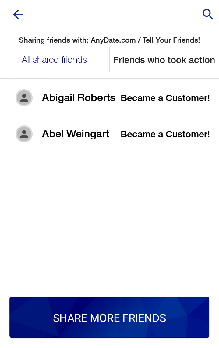 Businesses can track referrals as well as update and reward customers for their efforts when friends take the desired action. From the ShareSomeFriends admin dashboard, you can view all referral activity, define and change the statuses of referred friends and create new campaigns and promotions to drive repeat business. Try it now!